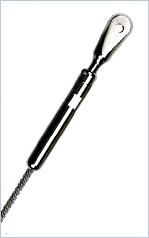 You can use our Invisiware® fixed tabs or threaded tabs (page 20) or lag eyes (page 21) to mount Adjust-A-Jaw® tensioners to your end posts. Or you can mount them using flat bar or angle iron welded to your post with holes drilled to accept the clevis. See the tabulated drawing and chart below to determine how this fitting interfaces with your end post. The clevis has a male thread that mates with the female thread within the body of the tensioner. The swaging ferrule is swaged onto the cable and holds the cable inside the body. The body rotates on the cable and provides a considerable amount of take-up during tensioning with an open-end wrench. After tensioning, the lock nut locks the assembly in place.